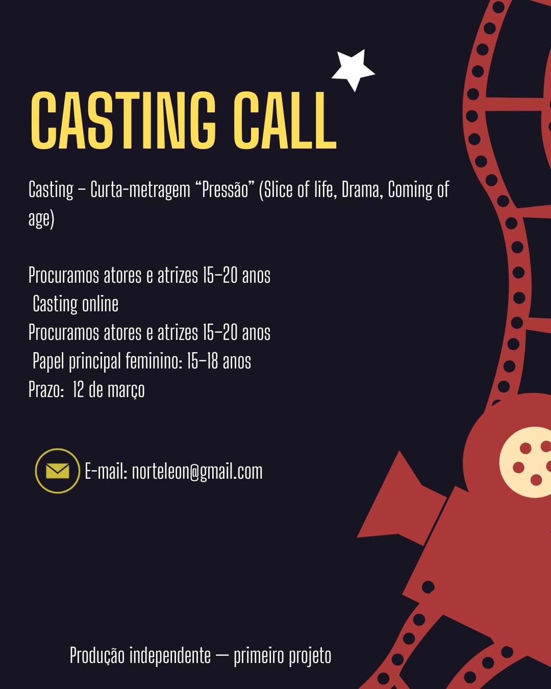 • Casting: online, após análise das candidaturas